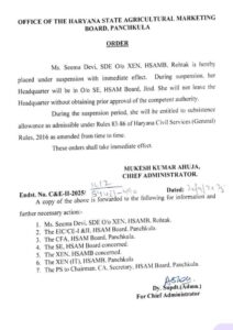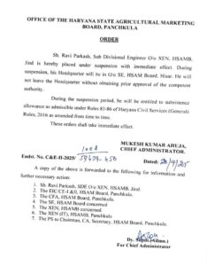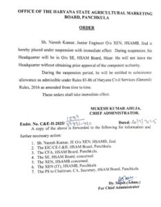मार्केटिंग बोर्ड के मुख्य प्रशासक द्वारा जींद मार्केटिंग बोर्ड के एसडीओ रवि प्रकाश, एसडीई रोशन लाल, जेई नरेश कुमार, जेई सुरेंद्र कुमार और रोहतक मार्केटिंग बोर्ड की एसडीई सीमा को सस्पेंड किया है। इस मामले में एसडीओ रवि प्रकाश से बात की गई, तो उन्होंने बताया कि उन्हें इस बारे में कोई जानकारी नहीं है।
