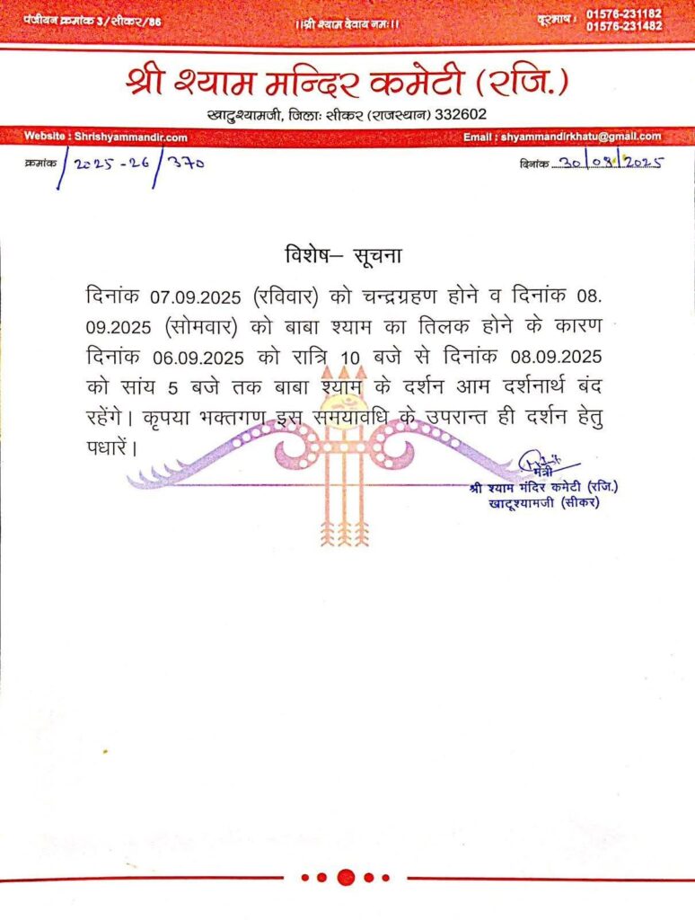 बता दें कि खाटू धाम जाने वाले श्रद्धालुओं के लिए बड़ी सूचना आई है। खाटू धाम में 07 सितंबर 2025 (रविवार) को चन्द्रग्रहण होने और दिनांक 08 सितंबर 2025 (सोमवार) को बाबा श्याम का तिलक होने के कारण तारिख 06 सितंबर 2025 को रात 10 बजे से दिनांक 08 सितंबर 2025 को शाम 5 बजे तक बाबा श्याम के दर्शन करने के लिए सामान्य तौर पर दर्शनार्थ बंद रहेंगे। यह जानकारी श्री श्याम मंदिर कमेटी (रजि.) खाटूश्यामजी (सीकर) की तरफ से दी गई है।